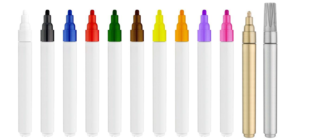 Marker for decoration. Filled with quick-dry, lacquer-like ink. Shake well before use. Store in horizontal position. Suitable for marking or decorating almost all kinds of surfaces. Xylene-free. Rounded nib 2‑4mm and 1‑15mm.