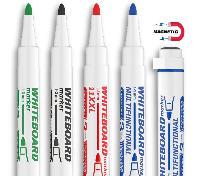 Dry-wipe marker for writing or drawing on whiteboards. Filled with cap-off ink. Thick tip available with either a bullet or chisel nib. Ink is xylene- and toluene-free, made by European manufacturers.